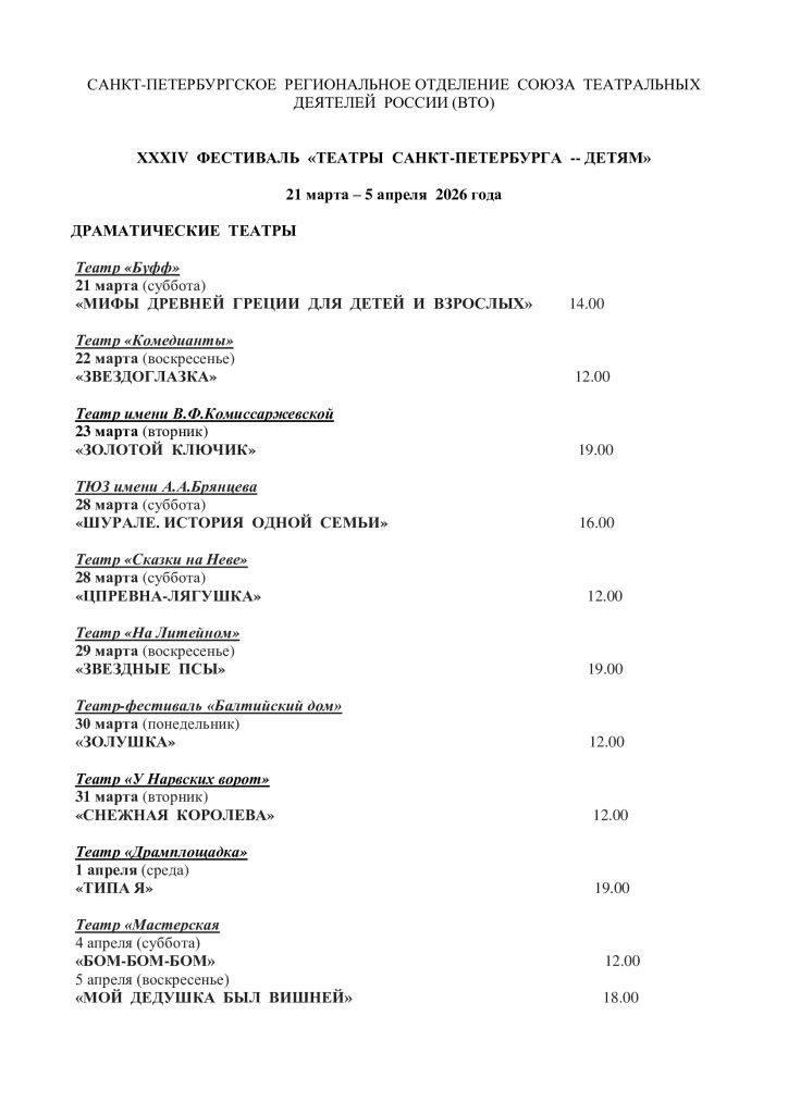 состоящих на учете в Санкт-Петербургском региональном отделении Общероссийской общественной организации «Союз театральных деятелей Российской Федерации (Всероссийское театральное общество)», в соответствии с утвержденным графиком проведения Отчетно-выборной компании в отделениях СТД РФ, предшествующей X (XXIV) Съезду СТД РФ, очередная Отчетно-выборная конференция Санкт-Петербургского регионального отделения Общероссийской общественной организации «Союз театральных деятелей Российской Федерации (Всероссийское театральное общество)» будет проведена 20 апреля 2026 года.